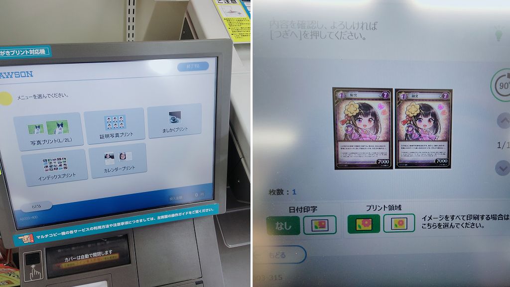 サイズ感が心配であれば、実物のカードを持っていき、まず「写真紙(L判30円)」でテスト的に印刷してみて、実物のカードサイズと印刷サイズが問題ないかチェックする。その後、シール紙で印刷すれば同じサイズで出力される。