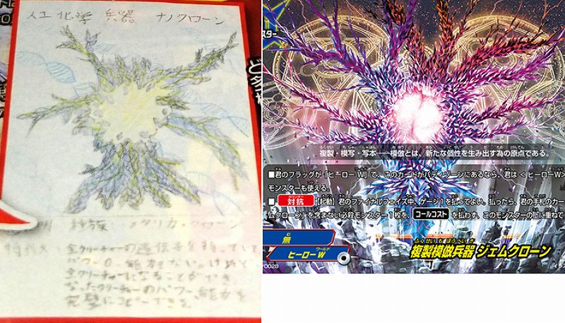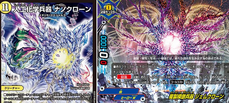 デュエル・マスターズの「人工化学兵器 ナノクローン」というカードが、バディファイトの「複製模倣兵器 ジェムクローン」というカードに似てると話題に。