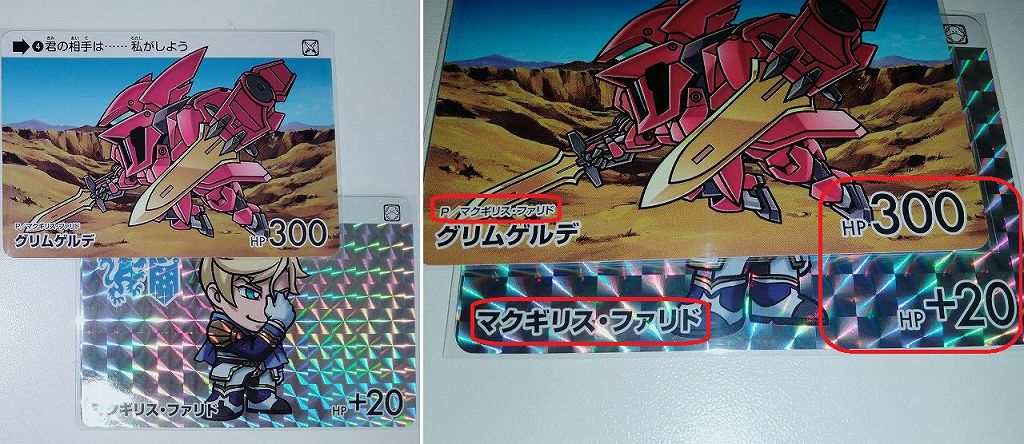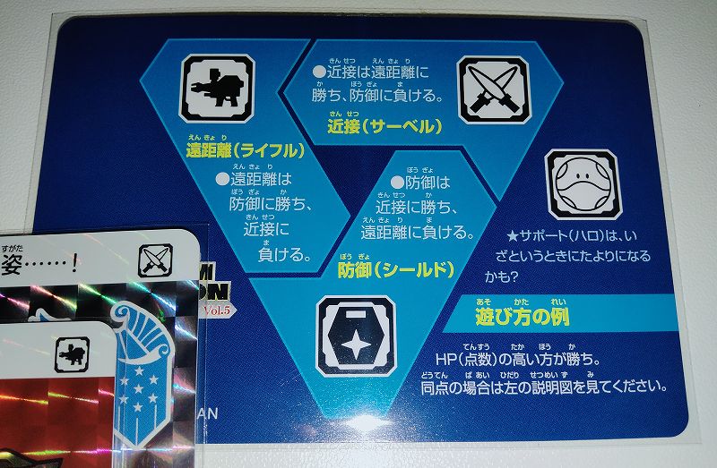 モビルスーツなどの機体のカードを同時に1枚ずつ出してHPが高い方が勝ち(HPが同じ場合はシンボル勝負) というシンプルなルールなのですが、
