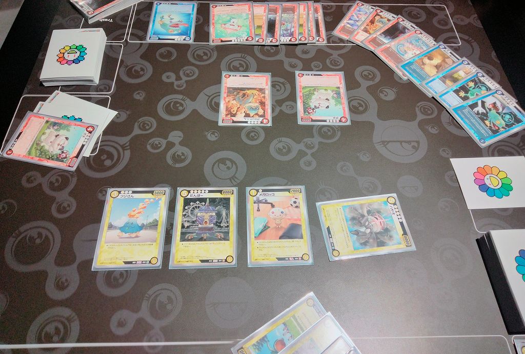 そしてゲームに勝った方が、対戦エリアの外に設置してあるボードに、使用したデッキの方に赤いシールを貼っていくみたいな企画をやっていたのですが、