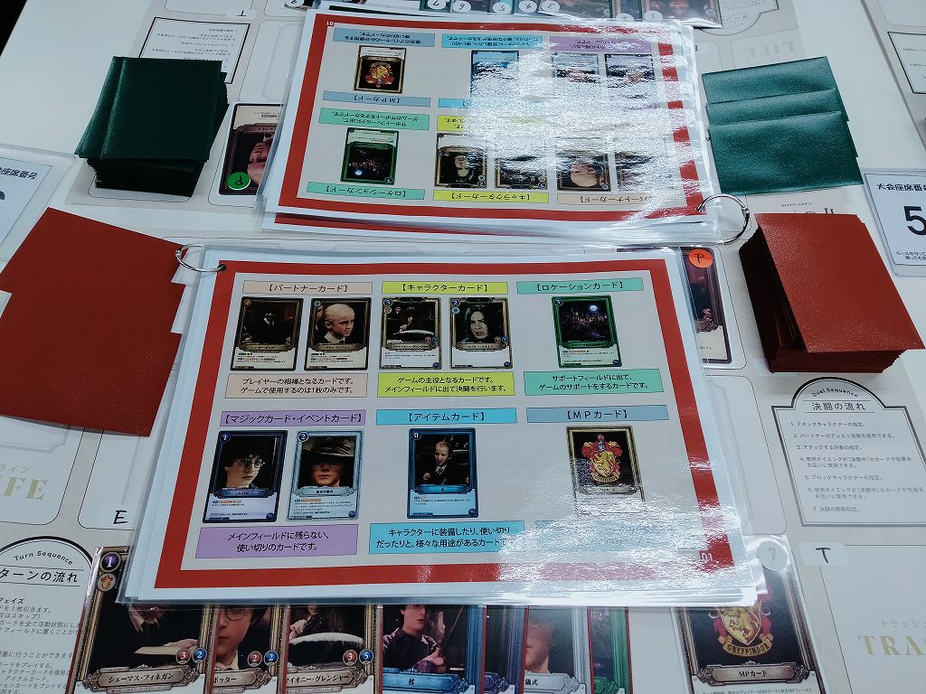 対戦スペースのテーブルの上には、体験会で使用する紙のプレイシートやカード、そしてルール説明時に使用するマニュアルが置かれていました。