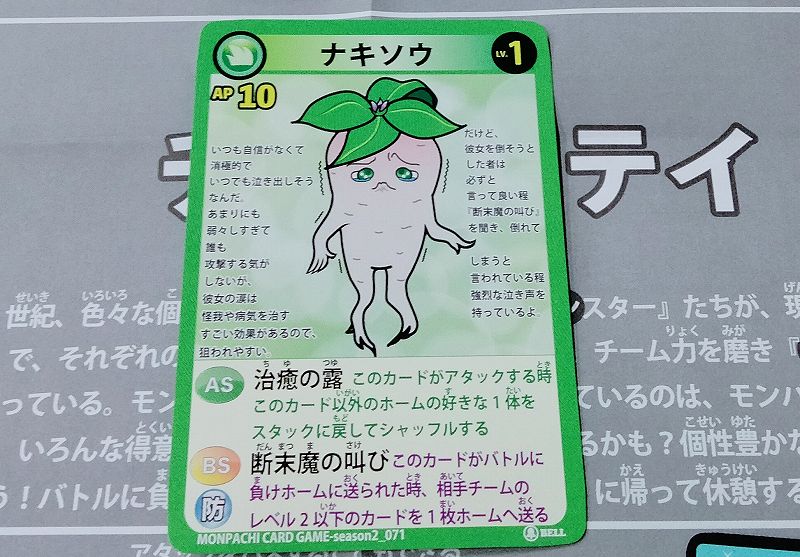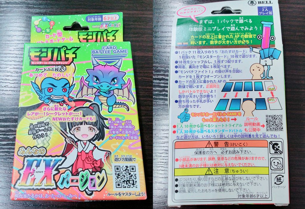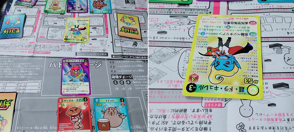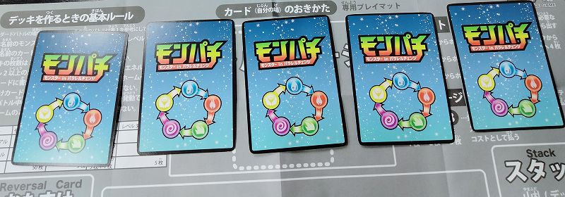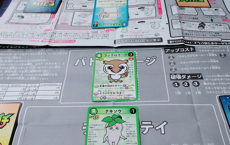 こちらのカードゲームですが4つの対戦ルールがあり、デッキ構築せず1パック購入して10枚を5枚ずつ配り分けて対戦する「体験版ミニプレイ」。そしてモンスターカード10枚&おたすけカード1枚でデッキ構築し対戦する「ショートトライアル」、同様にモンスターカード30枚&おたすけカード3枚で対戦する「スタンダードバトル」、モンスターカード50枚&おたすけカード5枚で対戦する「アドバンスバトル」が存在します。