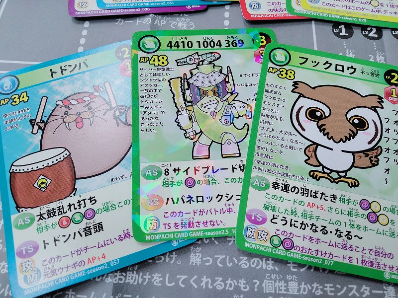 ゲーム後に他のパックに入ってるカードとかも見ていると、おたすけカードで高APの相手モンスターを倒せるものがあって、デッキに入れれる高レベルモンスターの枚数制限や、高レベルモンスターにはコストも必要なため、構築すれば結構面白い勝負になるのかなと。