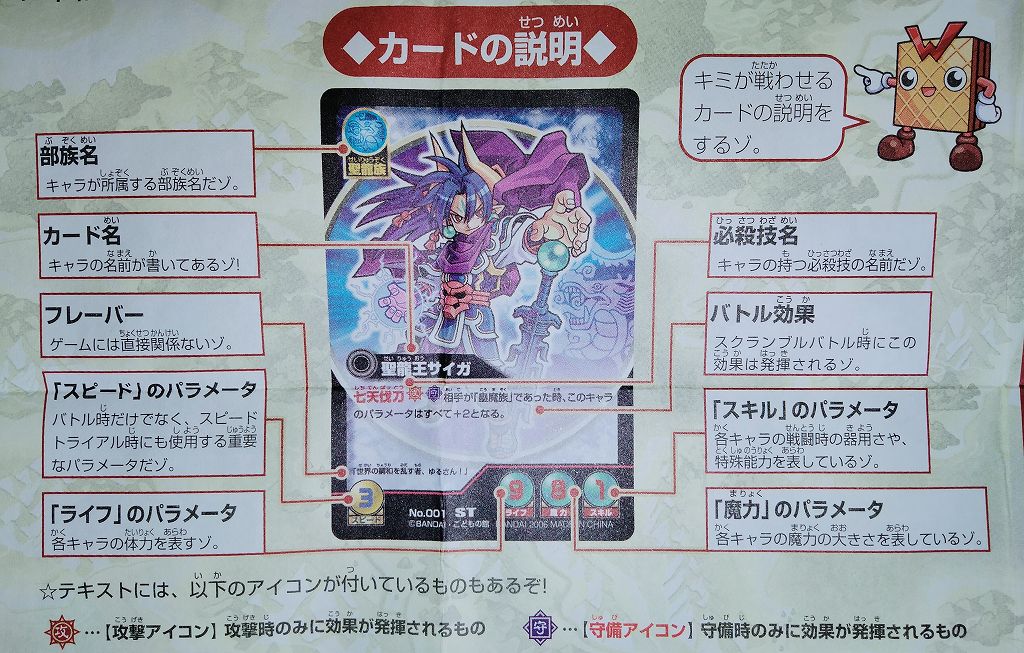 (1)攻撃側プレイヤーは、自分の山札の一番上のカードを表向きで「スクランブルバトルカード置き場」に出し、そのカードのパラメータ4つ(スピード/ライフ/魔力/スキル)のうち1つを選択し、宣言する。