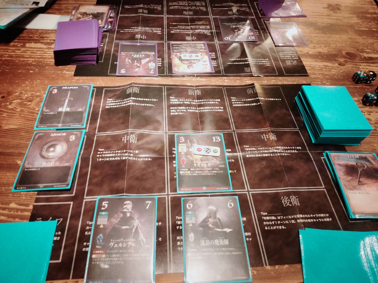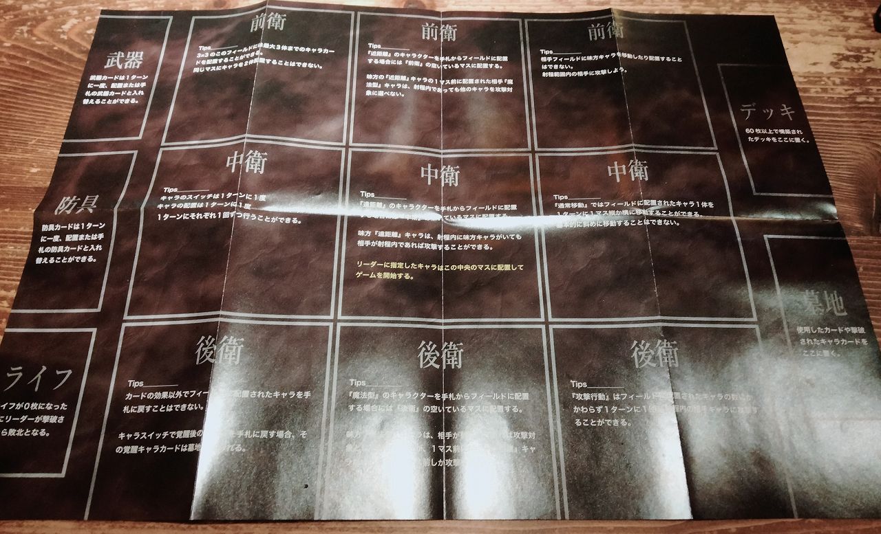 こちらのTCGは、キャラカードを場に出してその攻撃により相手のライフを削るというゲームなんですが、そのキャラカードを出す”場”に特徴があって、お互いのプレイヤーの場は、3×3のマス目があります。